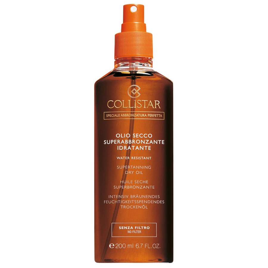 Collistar OLIO SECCO SUPERABBRONZANTE IDRATANTE water resistant Senza Filtro – Speciale abbronzatura perfetta – Una preziosa formula che abbina praticità d’uso, abbronzatura rapida ed eccezionale setosità della pelle. Ricco di Vitamina E e oli di calendula, nocciolo, carota e mallo di noce, nutre e idrata la pelle senza ungerla. Leggero e di rapido assorbimento, può essere usato anche per proteggere i capelli dalla salsedine e dal sole.